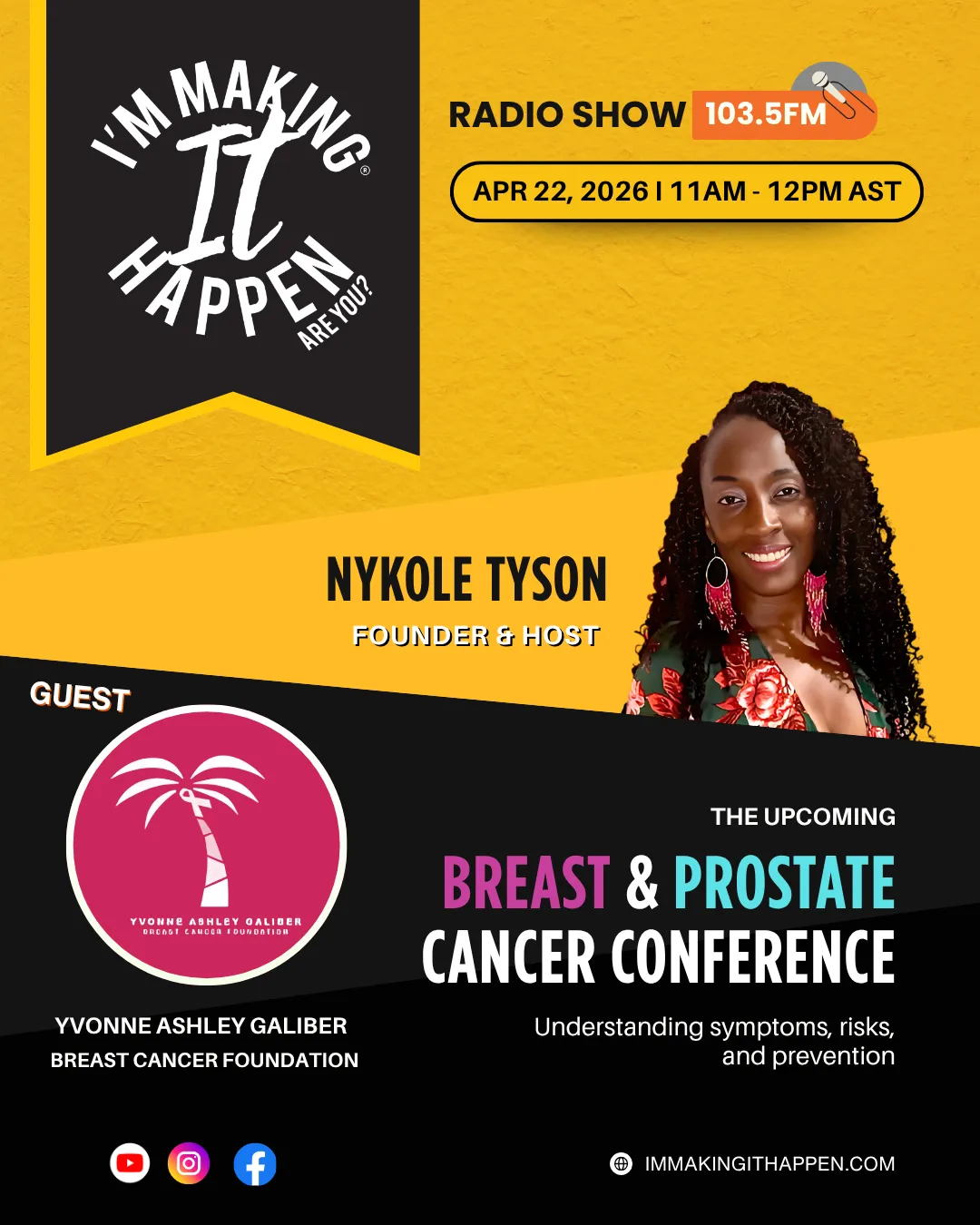 In this episode of the I’m Making It Happen Radio Show with Nykole Tyson, we’re joined by the Yvonne Galiber Breast Cancer Foundation and cancer survivor Michael Jones. We discuss the upcoming conference, why awareness and early detection matter, and Michael’s powerful story of surviving multiple cancers.
